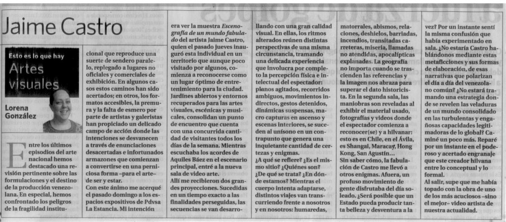Artículos de Prensa Publicado en El Nacional en 25 de Octubre de 2011 en la Columna de Lorena González, Curadora y Crítica de Arte Venezolano JaimeCastro. Texto crítico realizado por Katherine Chacón, Curadora Venezolana para la Revista ARTNEXUS No. 84 Marzo-Mayo 2012